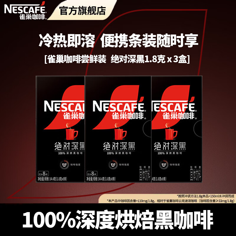 雀巢(Nestle)咖啡醇品深黑燃魂美式无糖低脂速溶纯黑咖啡粉办公健身 绝对深黑8条*3盒