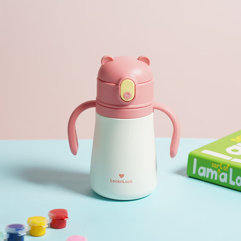 乐扣乐扣(LOCK&LOCK)儿童吸管双把手保温杯 宝宝316不锈钢学饮杯便携水杯380ml 橘粉