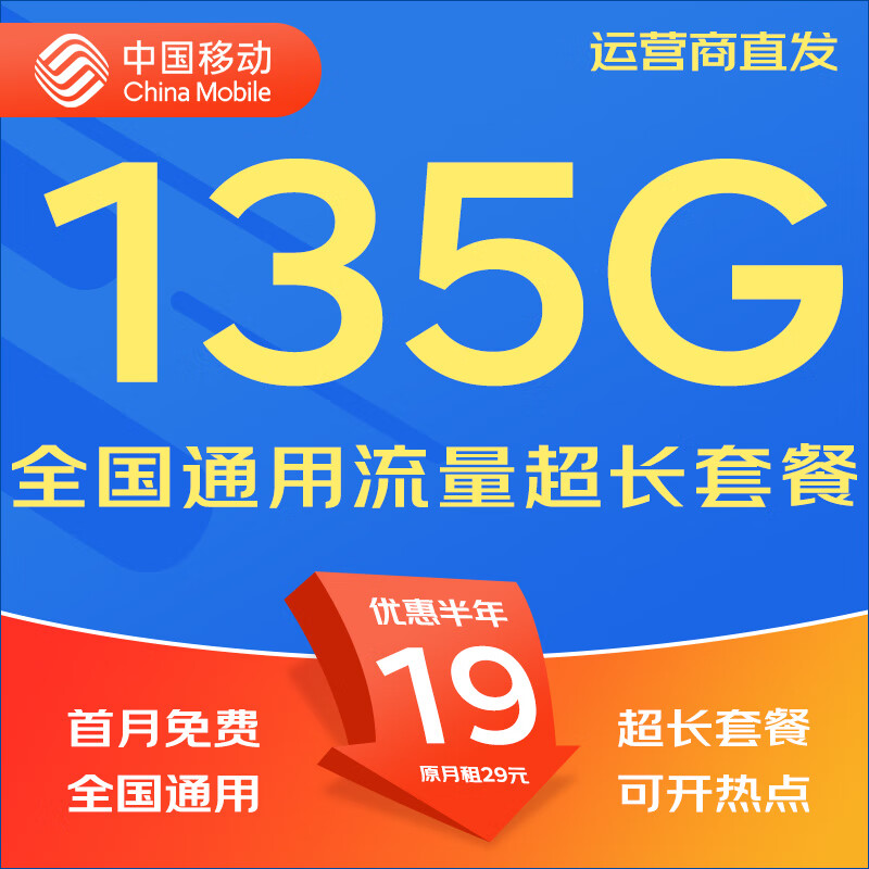 中国移动移动流量卡5G全国不限速手机卡电话卡低月租无限流量卡大流量上网卡大王卡 动心卡丨19元135G全国通用流量丨全国可发