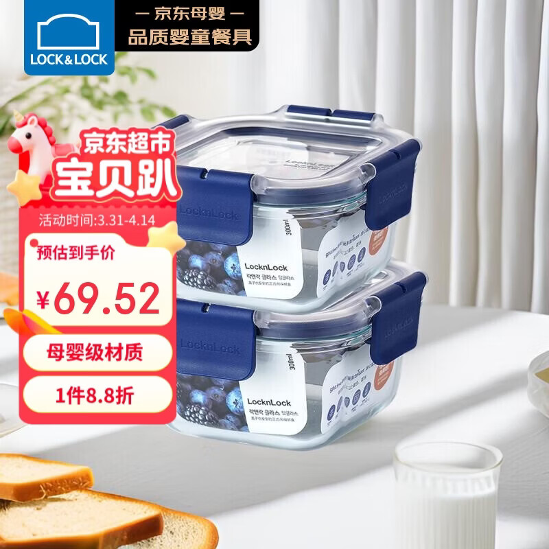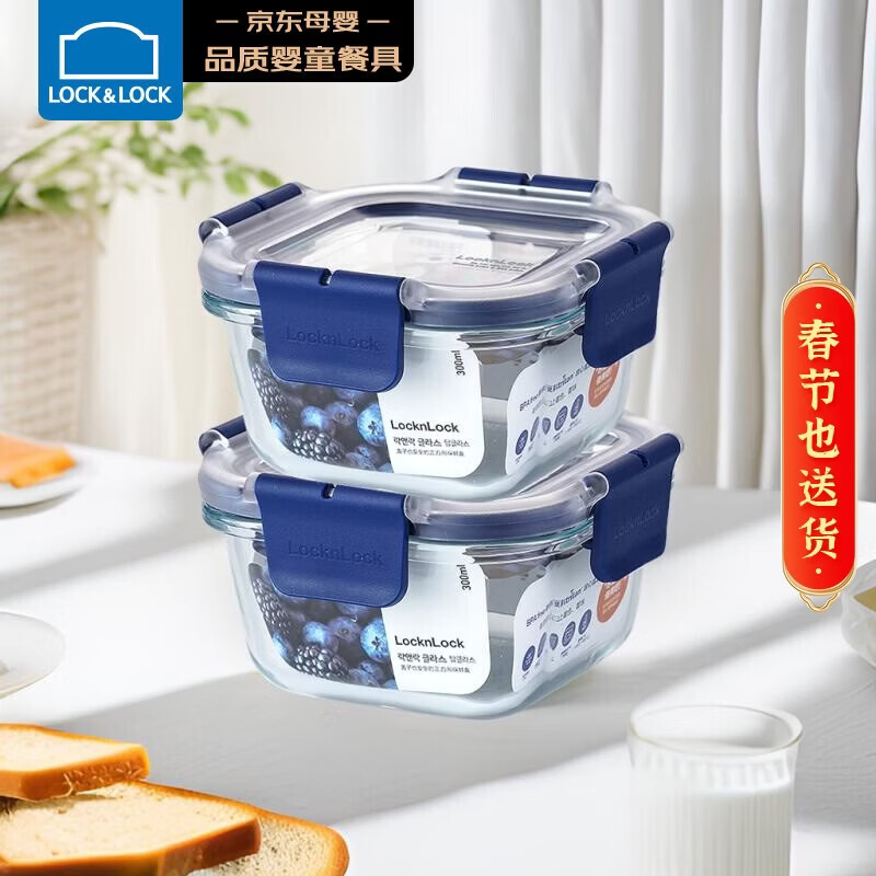 乐扣乐扣(LOCK&LOCK)婴儿耐热玻璃辅食盒宝宝儿童辅食碗可冷冻保鲜盒300ML*2蓝色方形