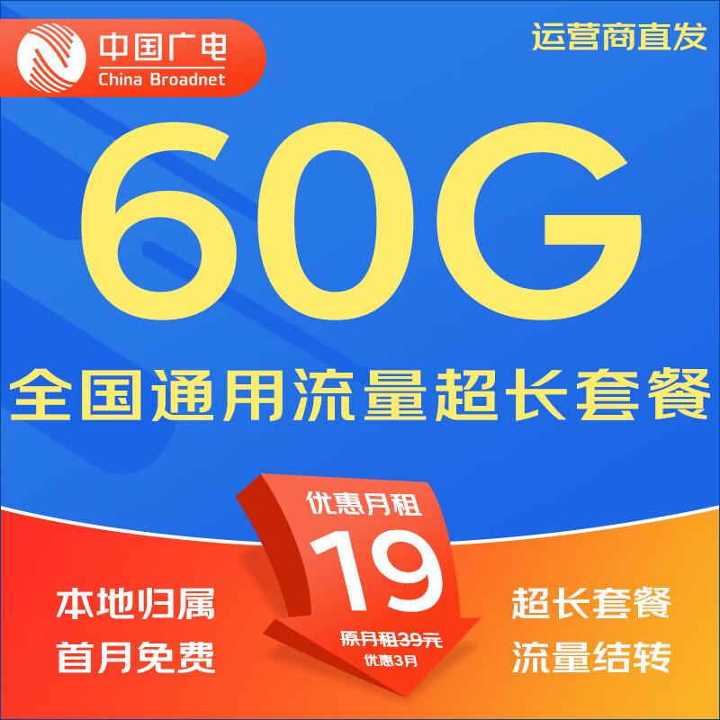 中国广电广电流量卡5G全国不限速手机卡电话卡低月租无限流量卡大流量上网卡大王卡 本地卡60G全国通用流量首月免费超长套餐