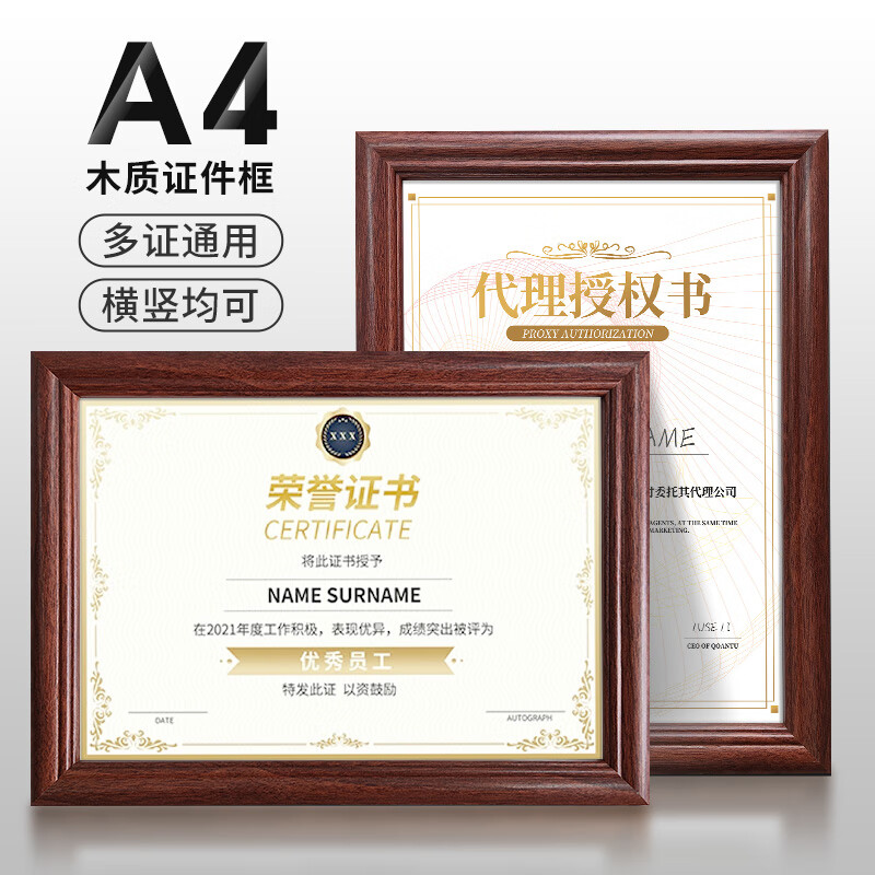 爱墨绘木质相框摆台营业执照正副本框结婚证件框挂墙照片相框胡桃木纹A4