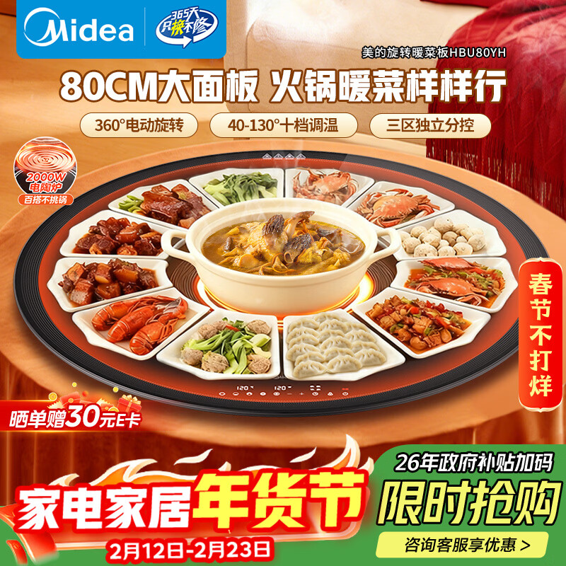 美的(Midea)小欢聚暖菜板加热热菜保温板 2000W电陶炉火锅家用多功能旋转餐桌转盘年货节(圆形80CM)HBU80YH