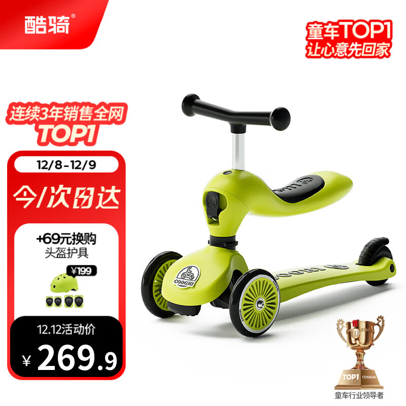 酷骑儿童滑板车V2二合一多功能童车重力转向静音1-5岁生日礼物经典绿