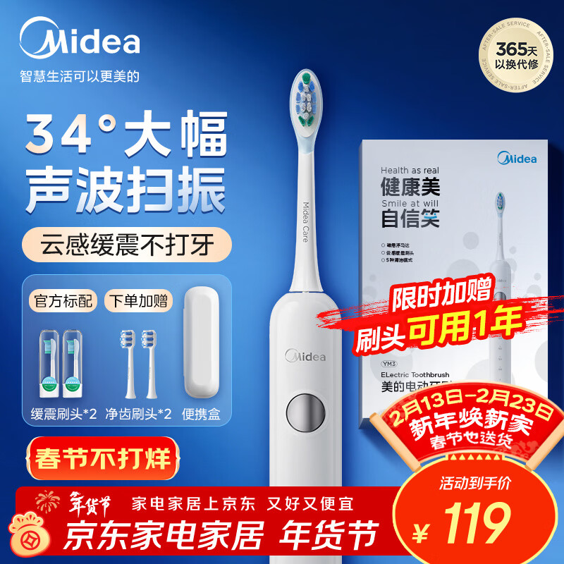 美的(Midea)电动牙刷成人声波扫振便携 180天长续航5种清洁模式高效清洁牙齿YM3白色男女专用情侣生日节日礼物