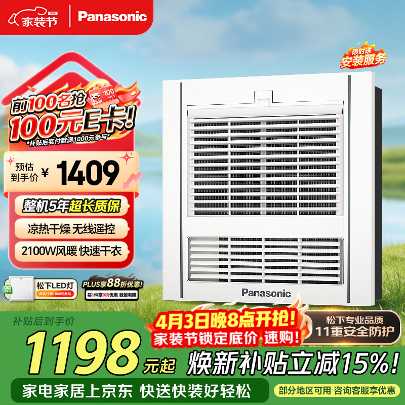 松下(Panasonic)风暖浴霸 浴霸风暖排气一体 浴室取暖器 暖风机浴室 FV-RB20Y1