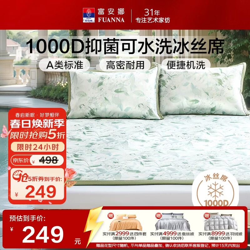 富安娜凉席 1000D冰丝席可水洗机洗 A类抑菌双人夏天席子 1.8x2米 薄荷