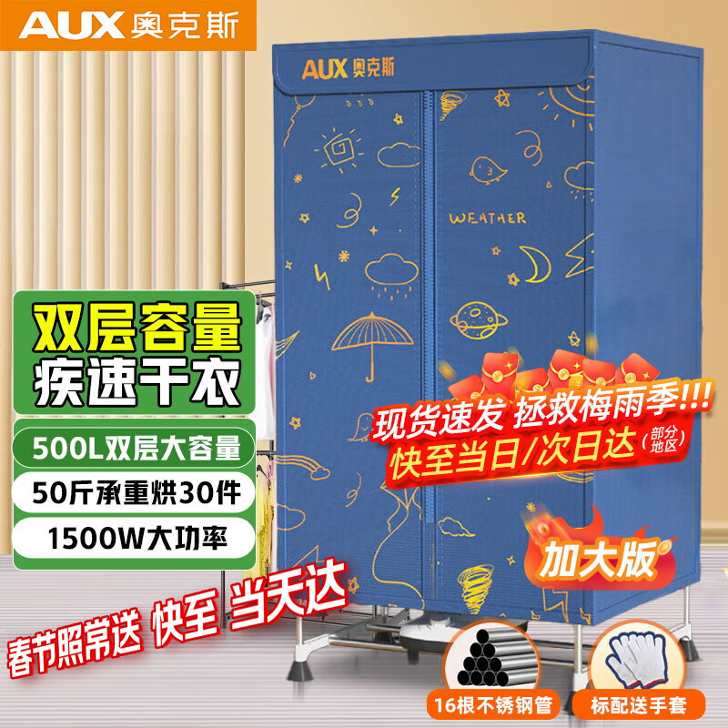 奥克斯【500L容量+1500w功率】烘干机家用干衣机烘干衣服神器婴儿衣物消毒脱水机小型宿舍衣柜式