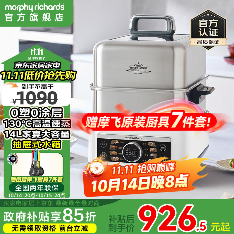 摩飞电器(Morphyrichards)多功能电蒸锅炖蒸煮一体多功能速蒸锅全不锈钢可视家用双层大容量速蒸锅预约保温MR1178 14L 椰奶白
