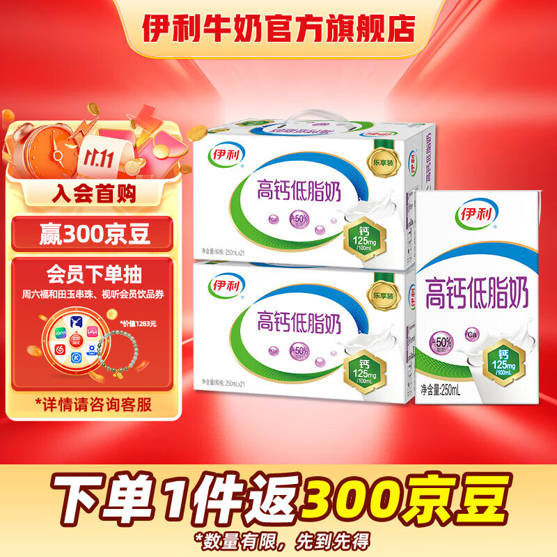 伊利高钙低脂奶250ml*21盒/箱*2箱 营养早餐 脂肪减半 礼盒装 8月产