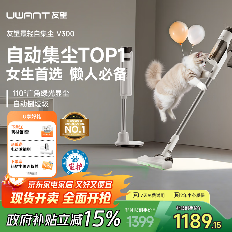 uwant友望吸尘器V300 自集尘洗【专利防缠 轻量推荐】长距绿光显尘大吸力无线手持家用扫地机除螨仪