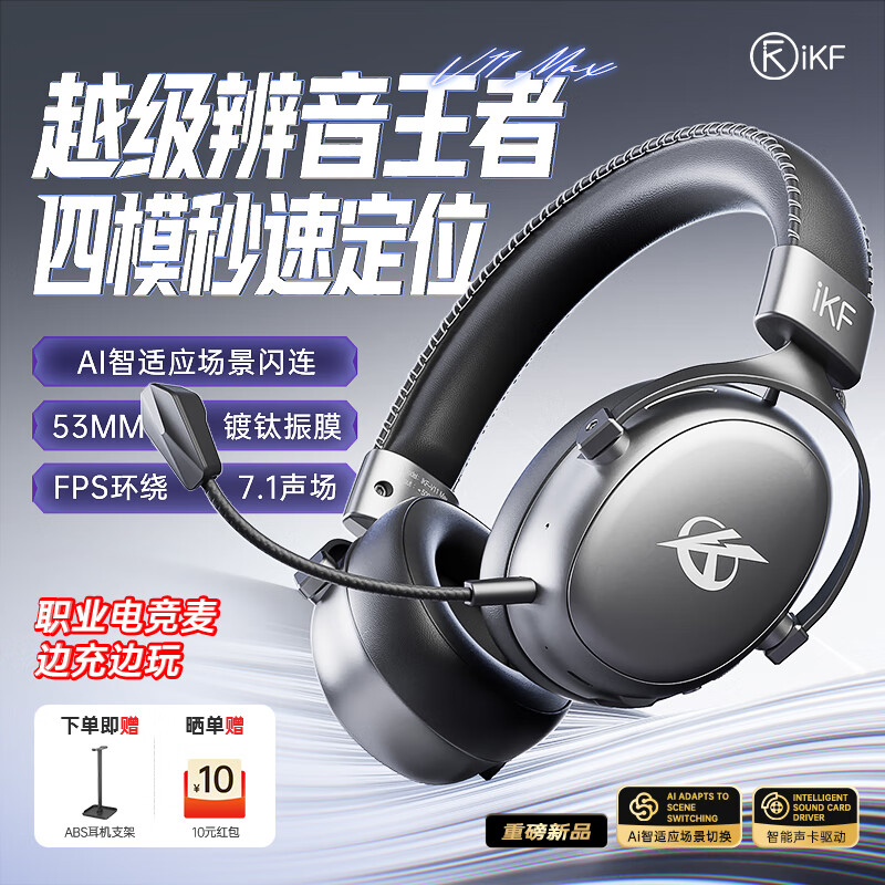 iKF V11 Max四模游戏耳机头戴式无线电竞7.1音效蓝牙有线FPS专用三角洲无畏契约cs听声辨位 钛银色