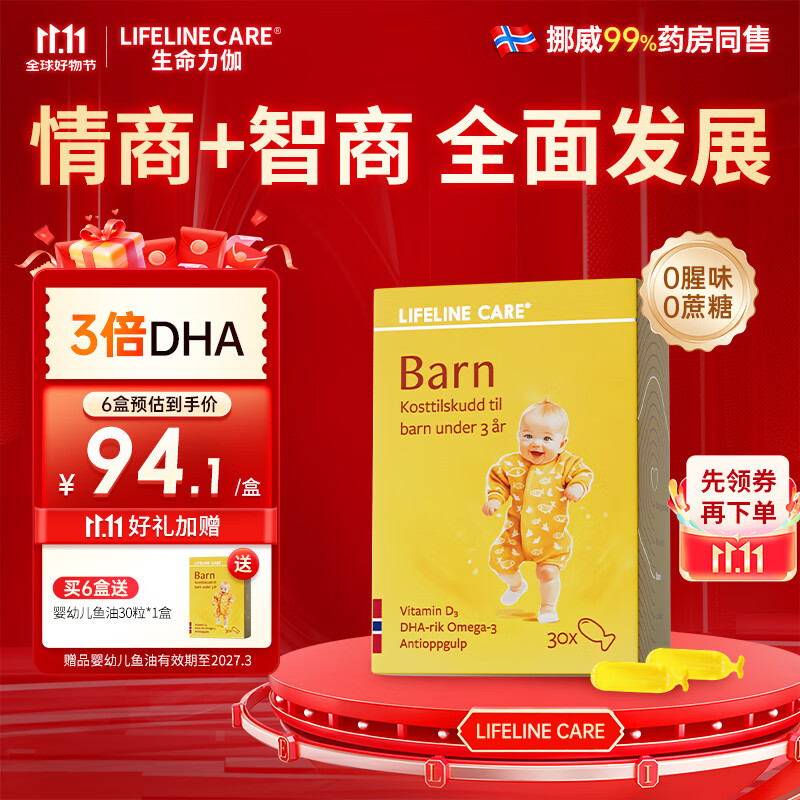 lifeline Care生命力伽婴幼儿DHA深海鱼油儿童挪威小鱼补脑omega-3非鱼肝油藻油 1盒