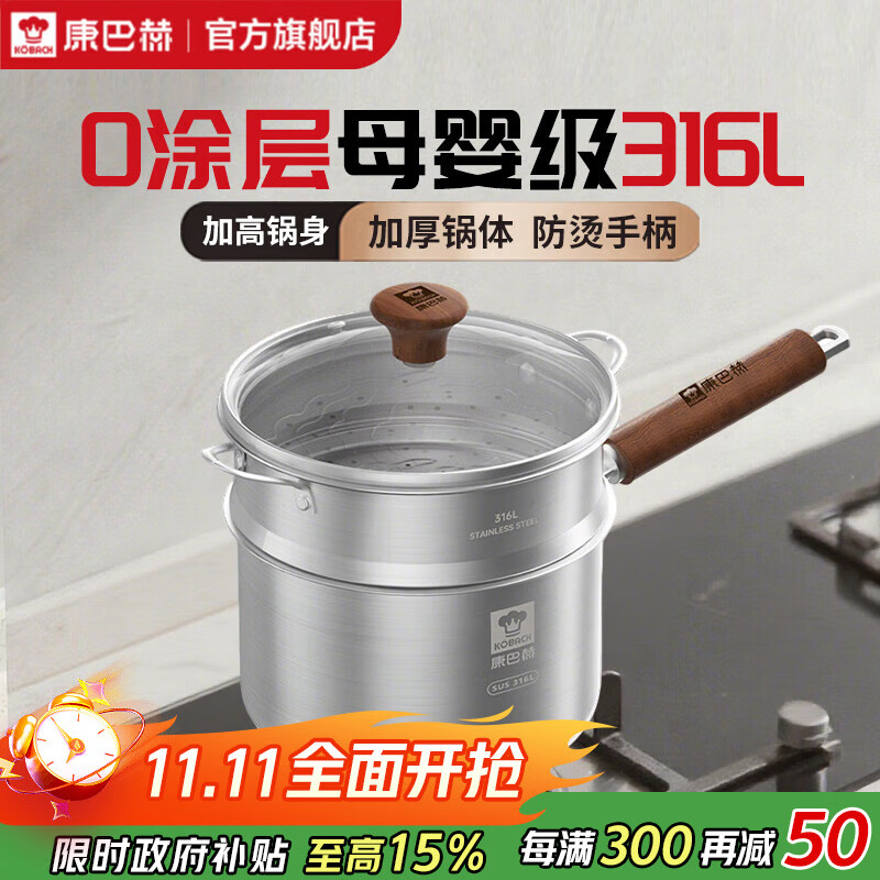 康巴赫奶锅316L不锈钢无涂层宝宝辅食锅婴儿小奶锅母婴煮面锅 【推荐】316L锅+ 316L蒸屉- 18cm