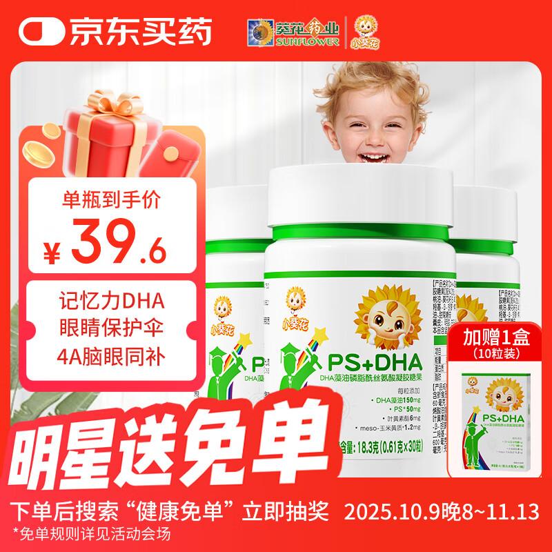 小葵花DHA藻油儿童3-12岁30粒*3瓶磷脂酰丝氨酸凝胶糖果神经酸脑营养品