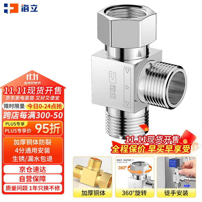 海立铜加厚三通活接头角阀龙头分水器一进二出上给水管四4分口三通28T