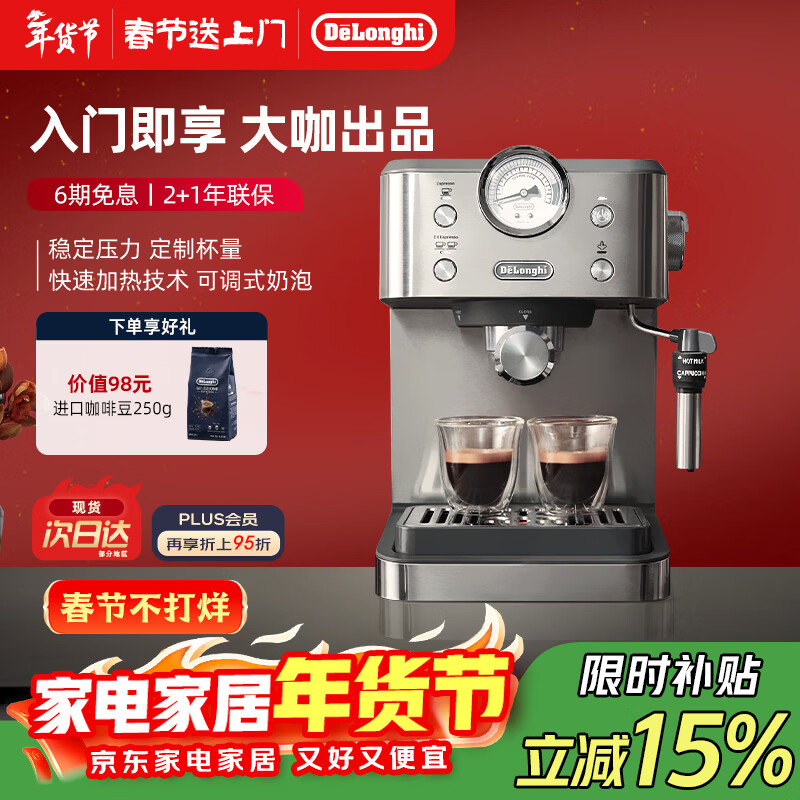 德龙(Delonghi)咖啡机 意式半自动家用15Bar泵压专业压力计 美式咖啡 快速加热技术 可调式奶泡 金属机身EM450.M 银色 小巧机身 稳定压力 定制杯量 自动关机