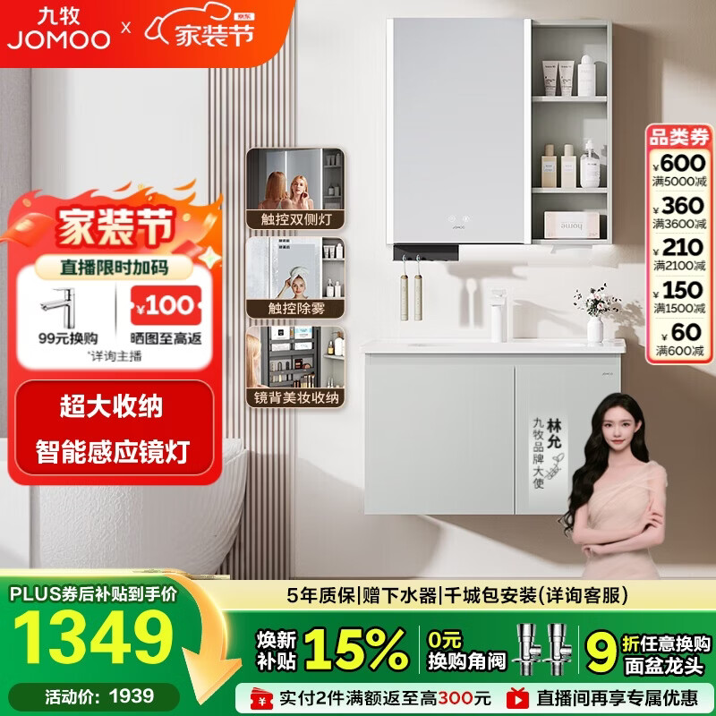 九牧(JOMOO)【超大收纳】智能浴室柜陶瓷一体盆冷灰色80cmA2741-14LD-ZS