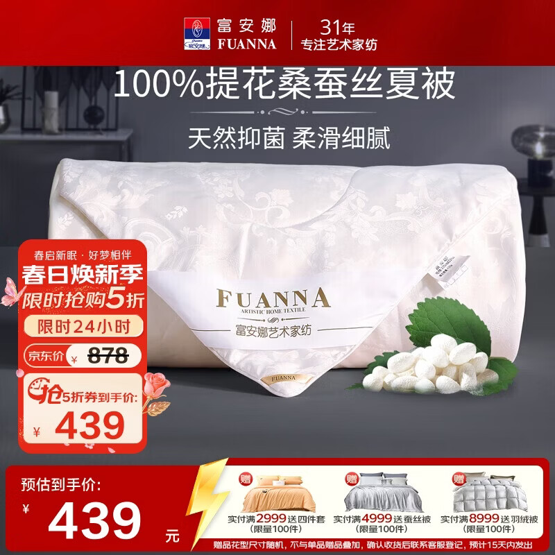 富安娜蚕丝被100%桑蚕丝夏凉被双人夏季空调被夏天薄被子3.4斤203x229cm