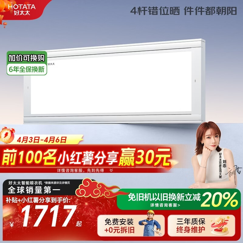 好太太(Hotata)小白鲸双控升降晾衣架电动超薄阳台智能晾衣机离线语音G61-四杆