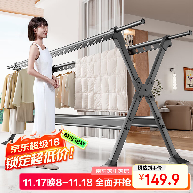 枫尚晾衣架落地伸缩晾衣杆免装折叠晒被架加厚铝合金阳台衣架落地立式