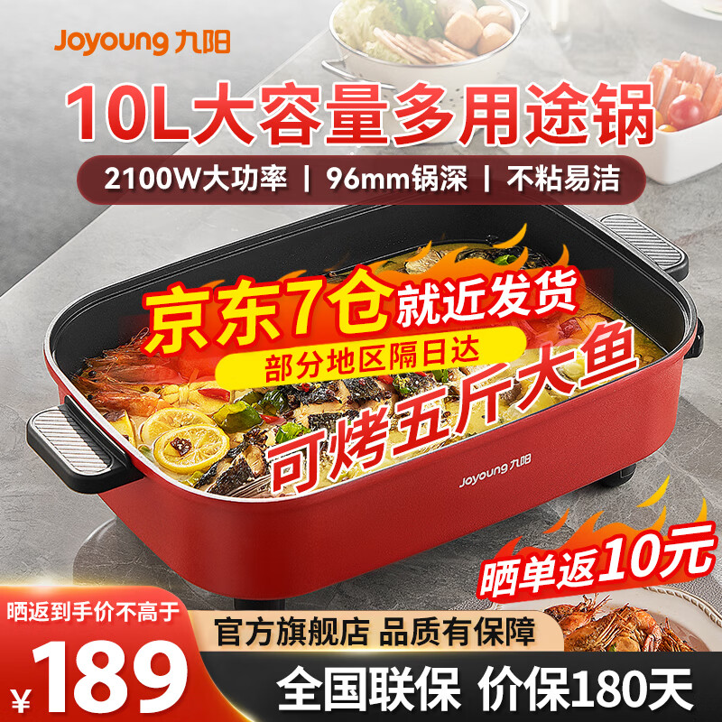 九阳 烤鱼锅烤涮一体两用锅电火锅专用锅长方形烤鱼炉电烤锅纸包鱼多用途锅烤肉电煮锅 10L 大容量可烤5斤大鱼G888