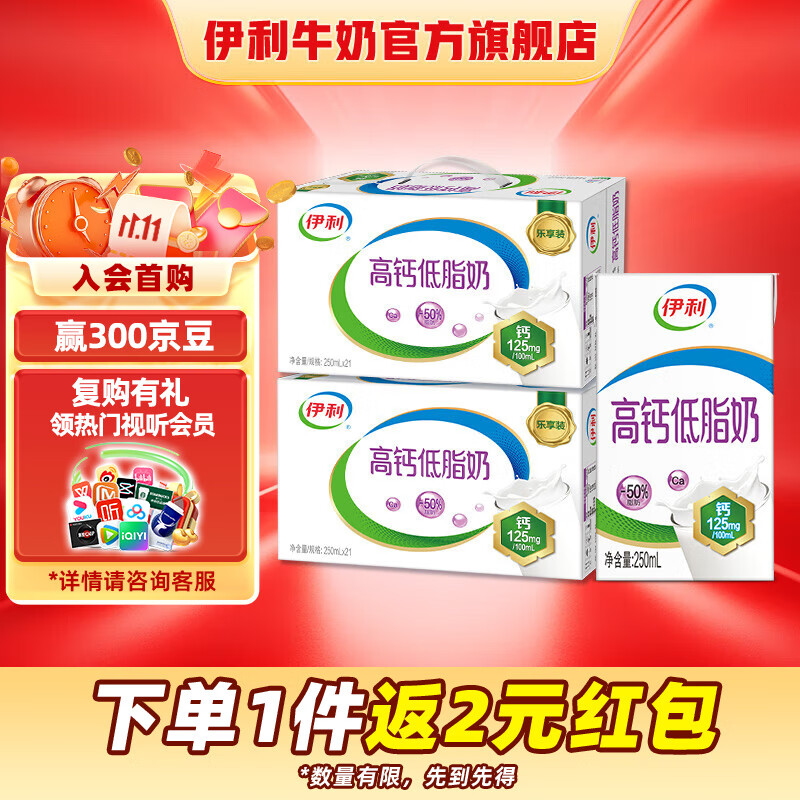 伊利高钙低脂奶250ml*21盒/箱*2箱 营养早餐 脂肪减半 礼盒装 8月产