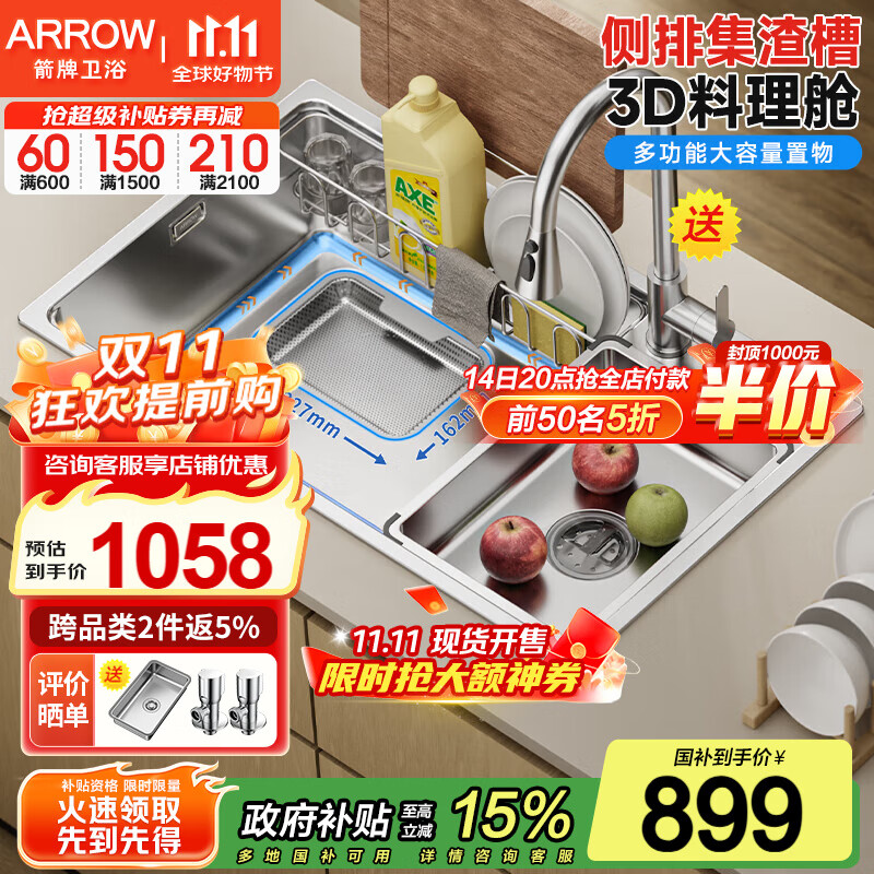 箭牌厨房水槽银色不锈钢拉丝大单槽厨房洗碗洗菜台下盆一体拉伸槽
