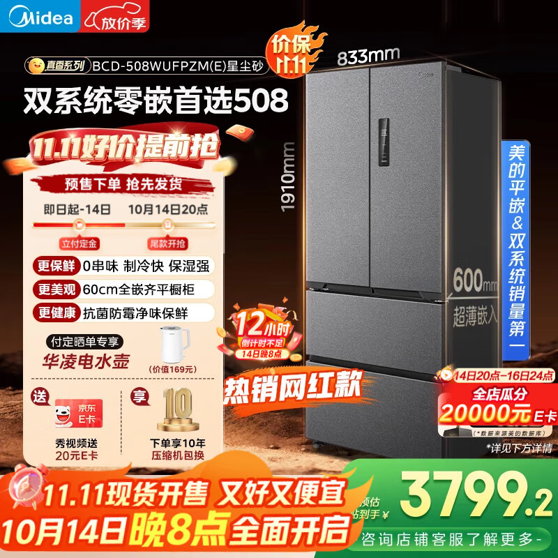 美的(Midea)真香系列M60双系统508法式多门四门家用冰箱超薄平嵌双循环大容量底部散热BCD-508WUFPZM(E)星尘砂