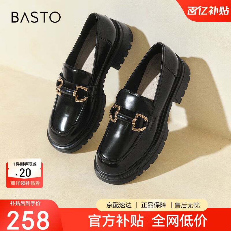 百思图乐福鞋女商场同款羊皮厚底松糕鞋女士休闲皮鞋TFW29CA2 黑色 37