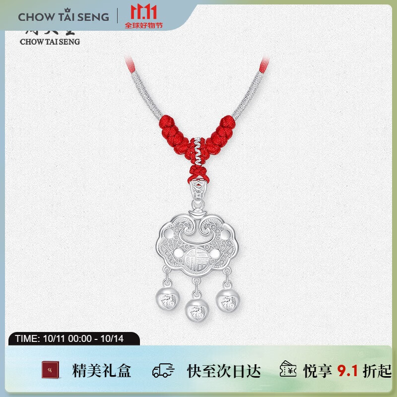 周大生足银如意福铃宝宝吊坠长命锁带编绳宝宝婴儿满月周岁见面礼