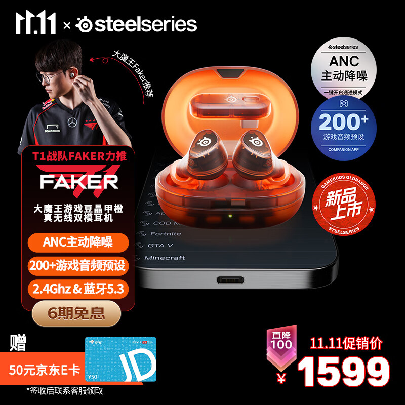赛睿(SteelSeries)寒冰大魔王游戏豆晶甲橙ArctisGameBuds真无线游戏耳机 TWS入耳式蓝牙2.4GHz电竞手机ANC降噪 透明