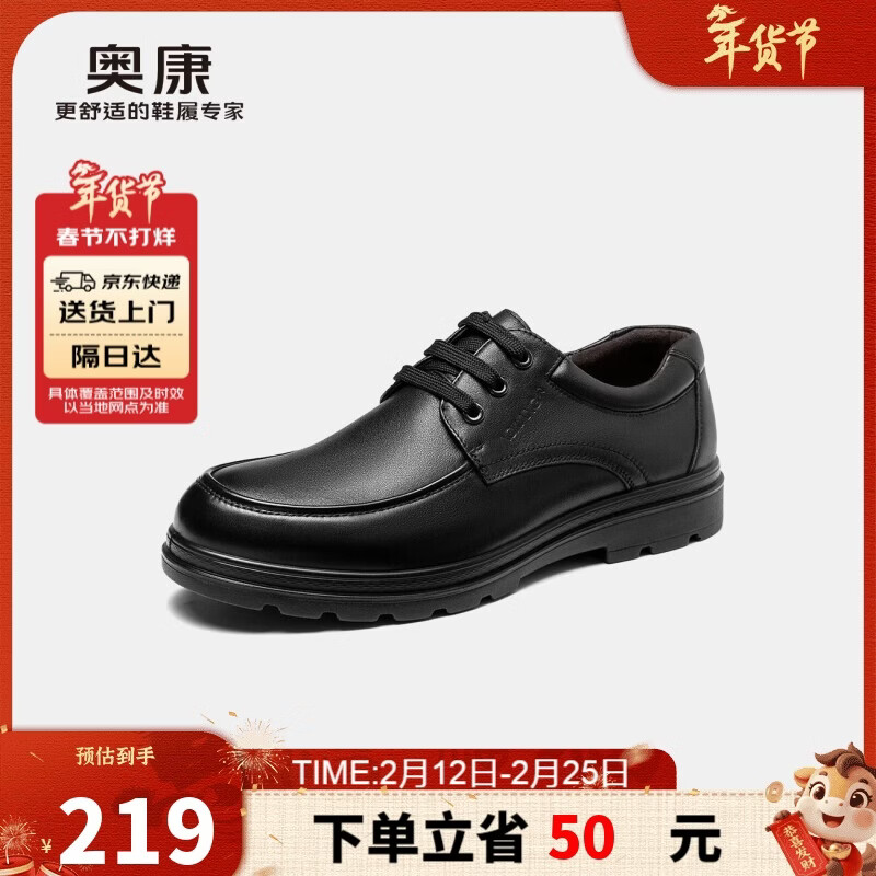 奥康(Aokang)官方男士商务通勤系带舒适休闲皮鞋透气西装牛皮鞋爸爸 黑色 41