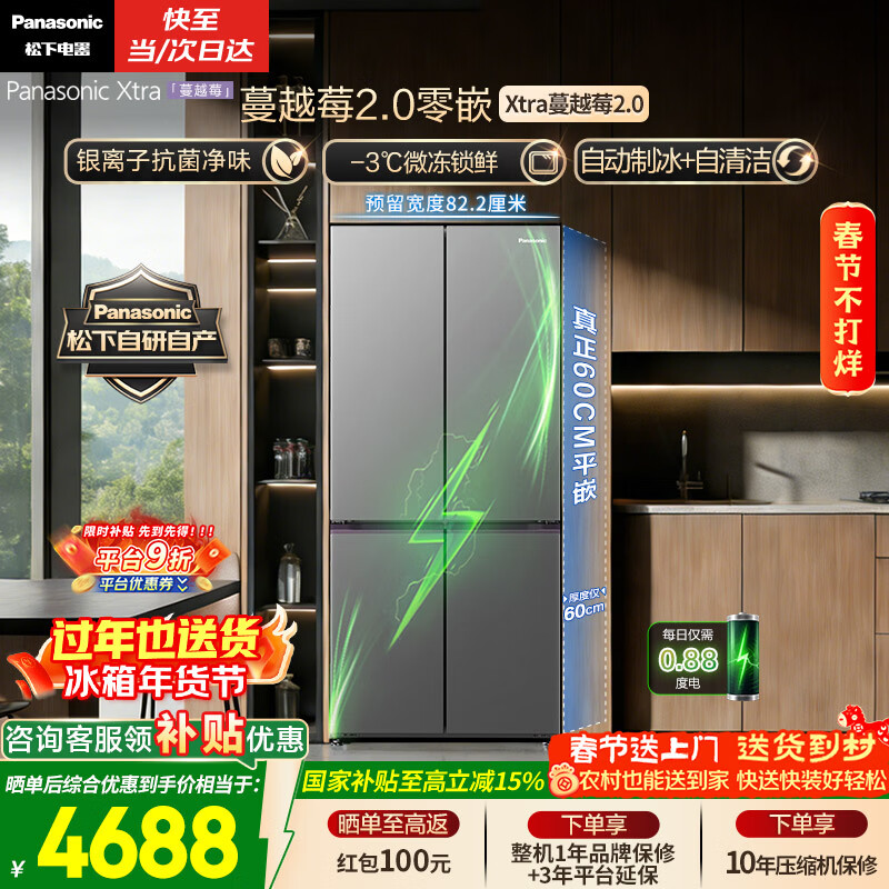 松下(Panasonic)Xtra蔓越莓2.0十字门500L冰箱四开门家用超薄零嵌入自动制冰一级能效NR-XD50C5B-H【国家补贴】