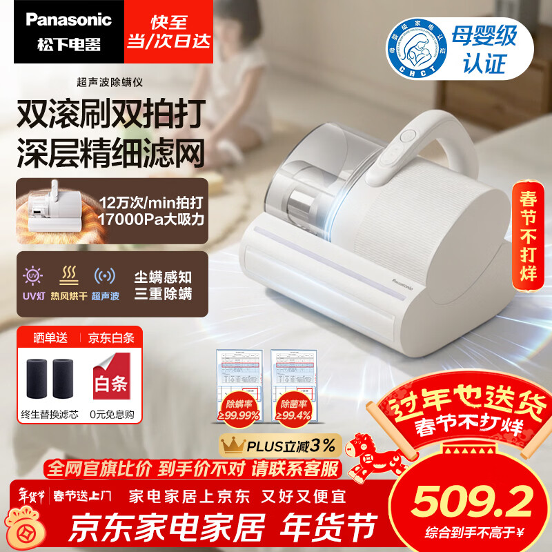 松下(Panasonic)【清洁神器】超声波除螨仪母婴级床宝家用床上吸尘器大吸力紫外线杀菌热烘除湿双滚刷双杯MC-DC25W