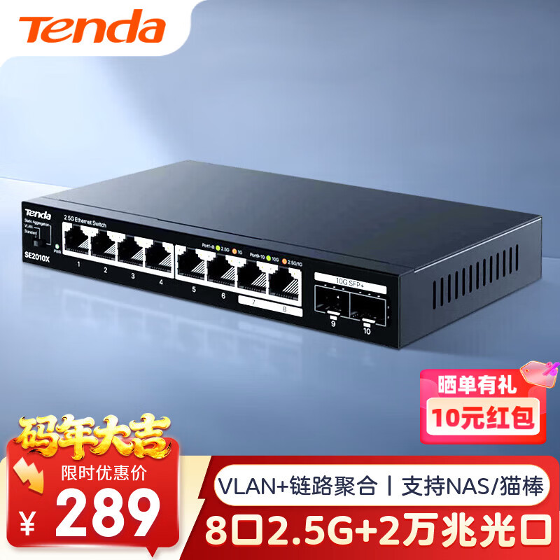Tenda腾达8口2.5G交换机+万兆双光口SFP+ 支持Vlan/链路聚合 网络网线分线器 兼容猫棒光猫NAS SE2010X