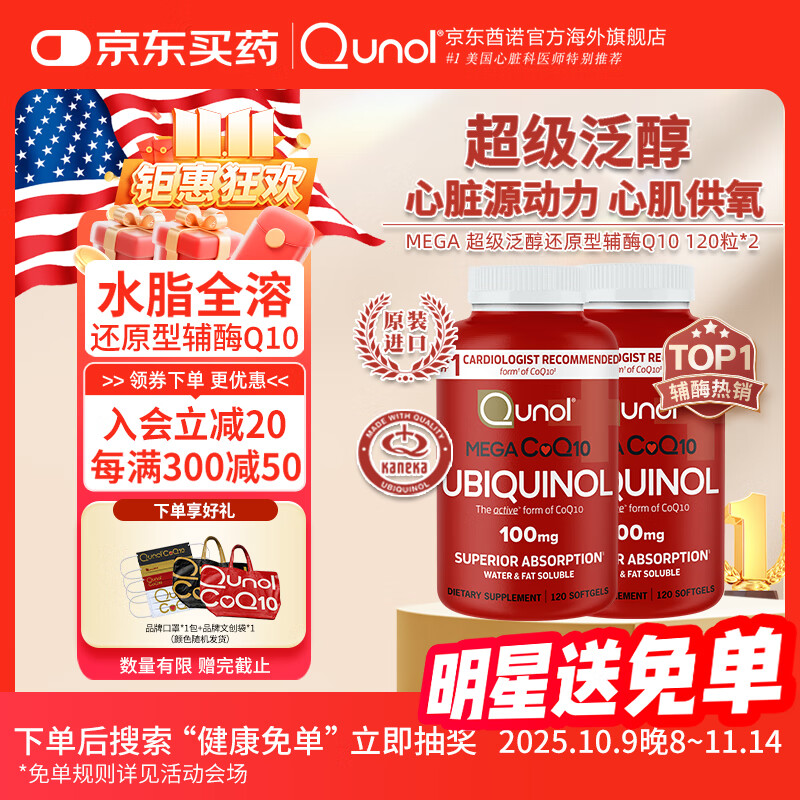 Qunol还原型辅酶Q10胶囊100mg120粒*2装水脂全溶超级泛醇美国原装进口 120粒/瓶*2