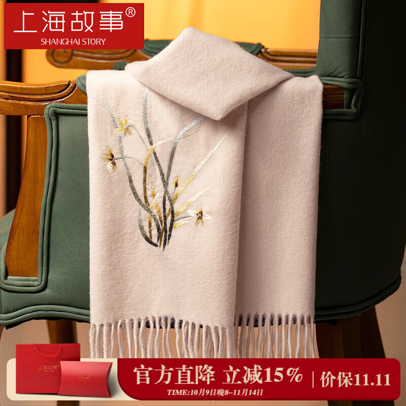 上海故事100%羊毛刺绣围巾礼盒秋冬季围脖女士送人生日礼物 兰心-米驼色