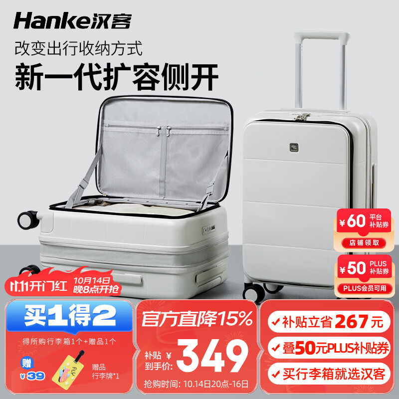 汉客扩容行李箱男拉杆箱女登机密码旅行箱46升大容量20英寸烟白色侧开
