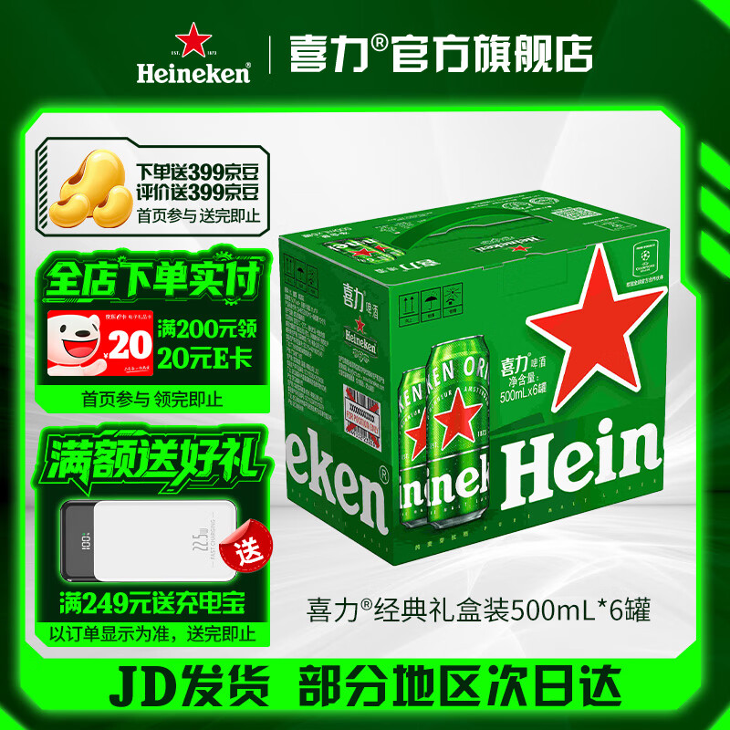喜力啤酒 经典整箱礼盒装 全麦酿造 原麦汁浓度≥11.4°P 500mL 6罐