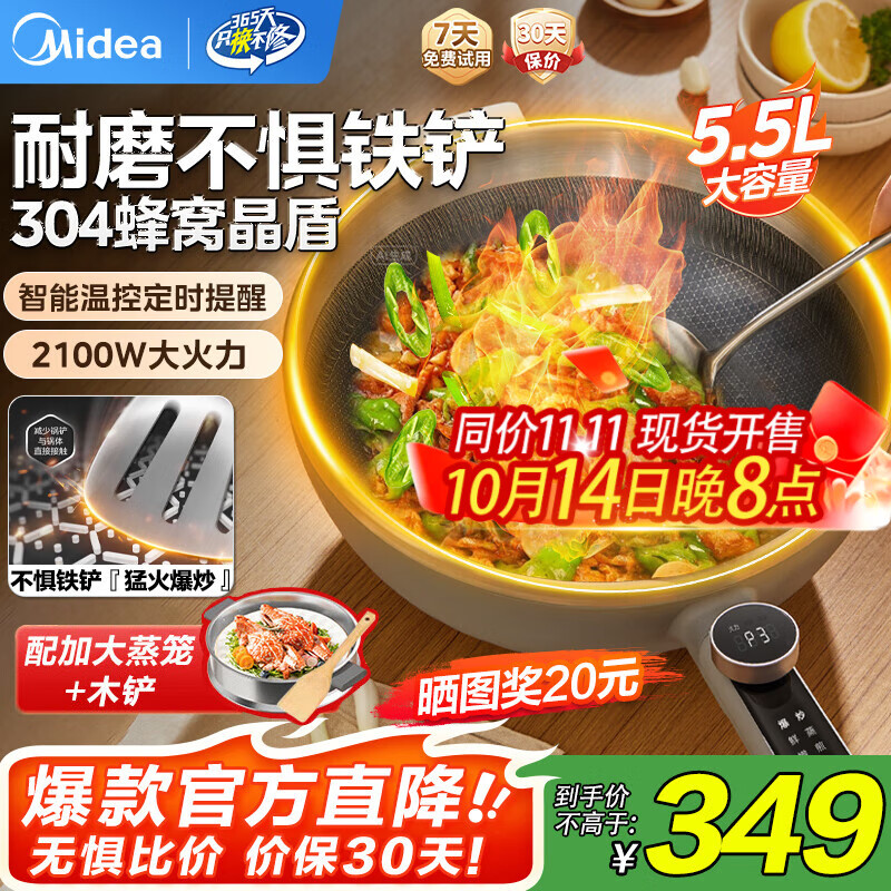 美的(Midea)电炒锅5.5升电蒸锅电煮锅电火锅炖蒸煮一体多功能锅炒菜锅304蜂窝晶盾不粘锅多用途锅电热锅智能 5.5L 【不惧铁铲】智控操作