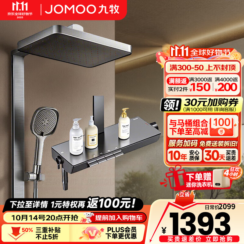 九牧(JOMOO)花洒淋浴花洒套装钢琴按键大置物方管贴墙淋浴顶喷喷增压淋浴器 丝雨星幕版36661爆款灰