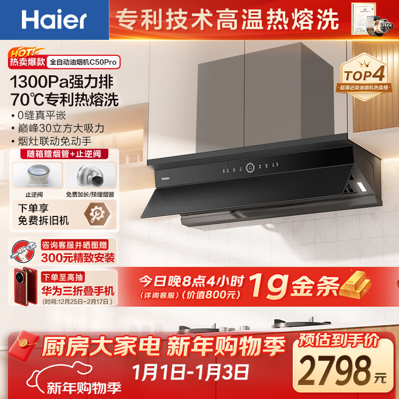 海尔(Haier)【下单抽华为三折叠】油烟机上门安装全自动顶侧一体抽吸排油烟机 30大风量烟灶联动热熔洗C50pro