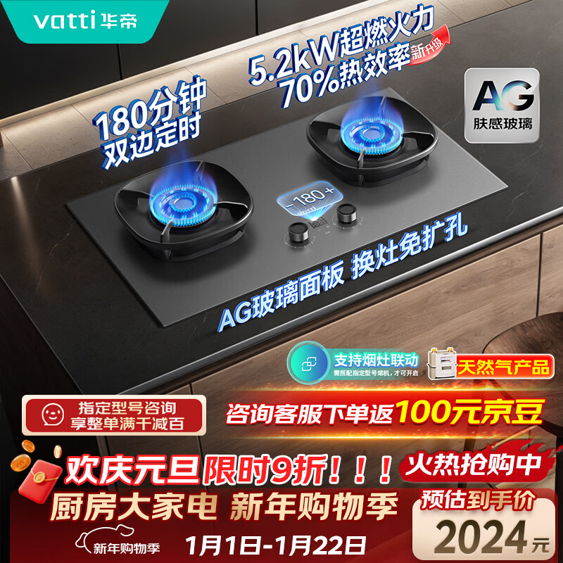 华帝【70%热效率+双定时+AG玻璃】i10308G燃气灶天然气嵌入式5.2kW猛火煤气灶台灶具搭配华帝油烟机S66