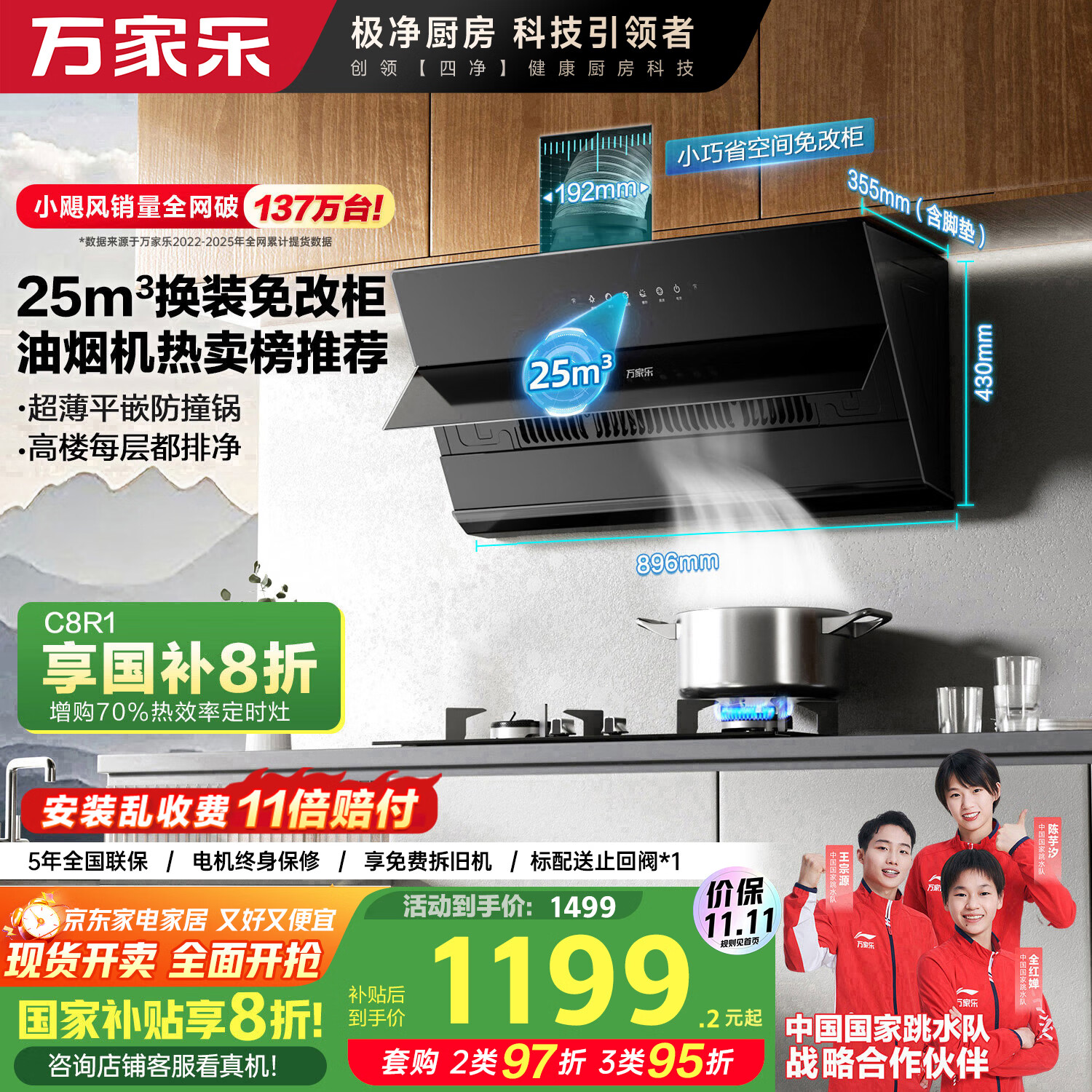 万家乐【小飓风J5R2】侧吸式跨界油烟机国家补贴20%超薄平嵌25m³变频换新免改柜挥手自清洗吸抽排油烟机
