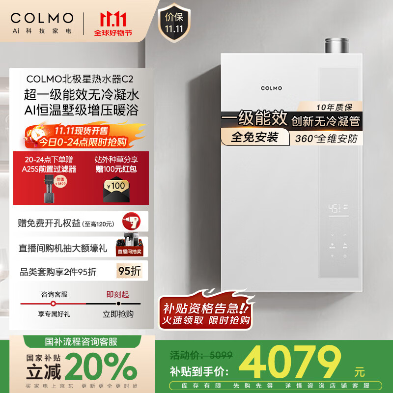 COLMO北极星热水器C2国家补贴以旧换新 16升天然气燃气一级能效冷凝式恒温 创新无冷凝管增压JSLQ27-C2