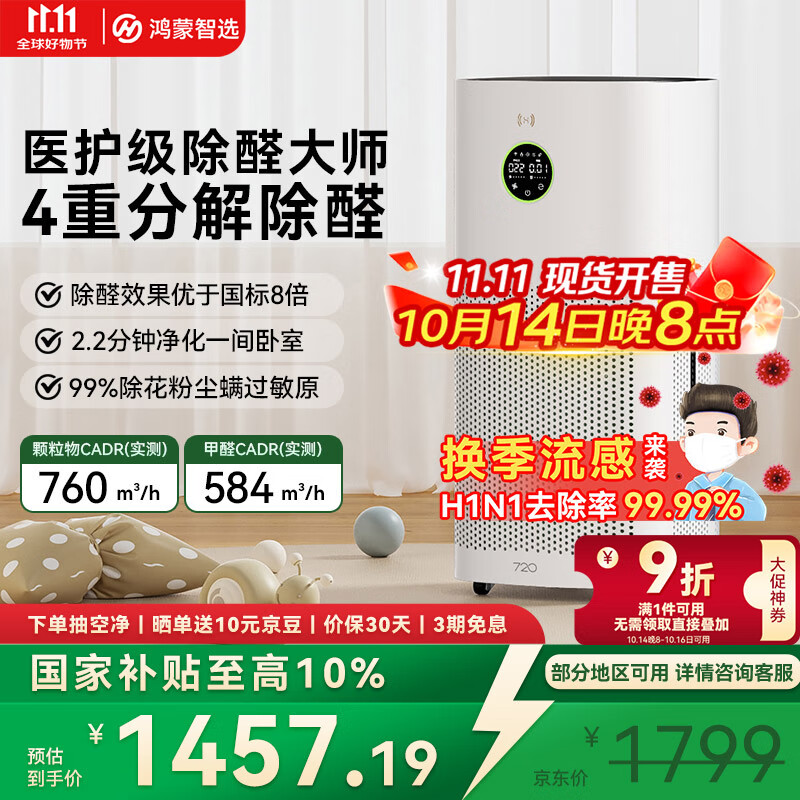 华为智选鸿蒙智选720空气净化器3增强版 医护级除甲醛新房专用除烟味除花粉过敏原宠物猫毛家用国家补贴