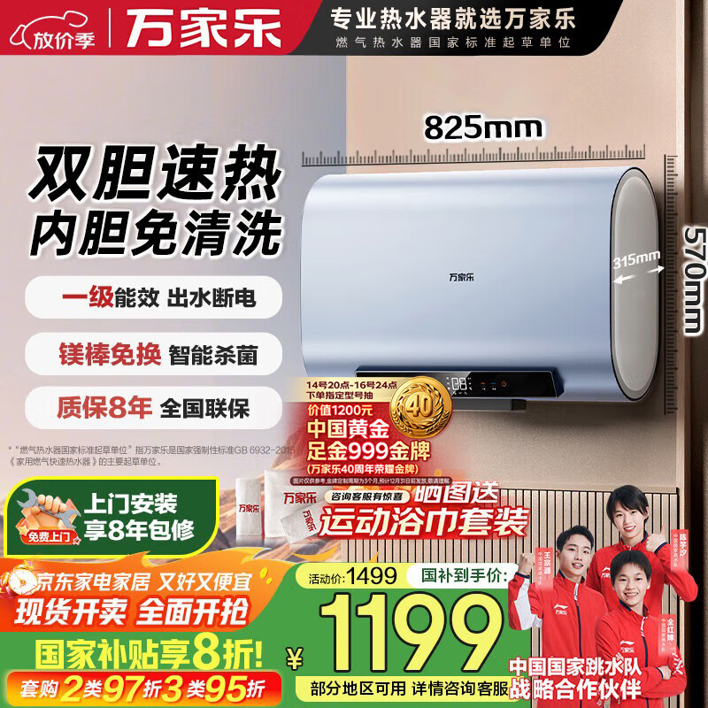 万家乐【云翼小蓝瓶D60-B5D1内胆免清洗】电热水器60升 双胆扁桶镁棒免换出水断电一级能效国家补贴20%