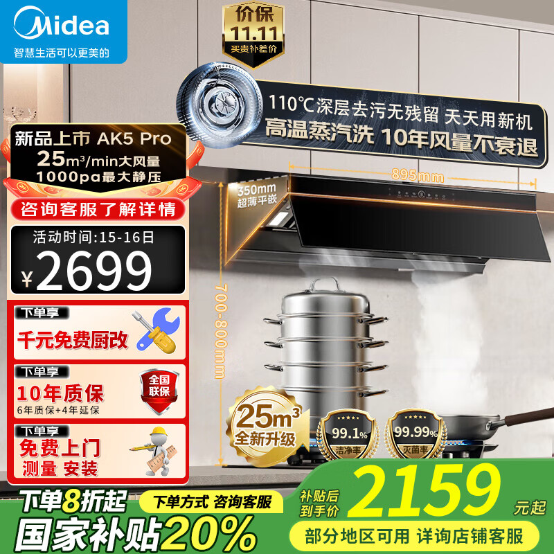 美的(Midea)【AK5pro升级款25风量】抽吸油烟机25顶侧一体欧式自清洁高温蒸汽洗变频巡航1000Pa静压 【黑色】蒸汽洗25m³烟机