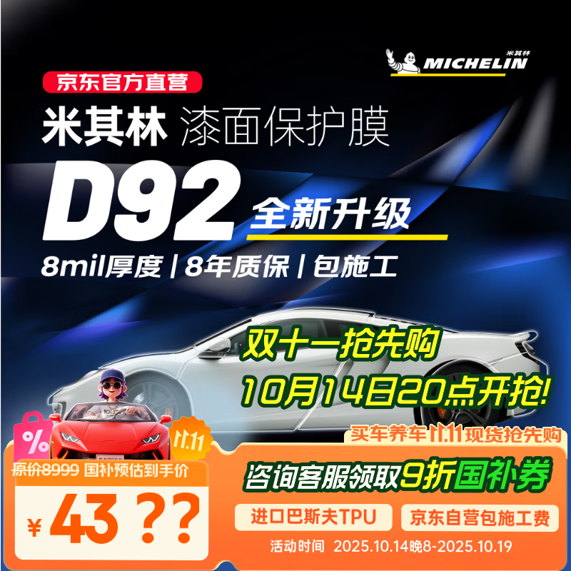 米其林D92【8MIL】包施工隐形车衣全车身贴膜TPU材质汽车漆面保护膜透明特斯拉su7问界国家补贴